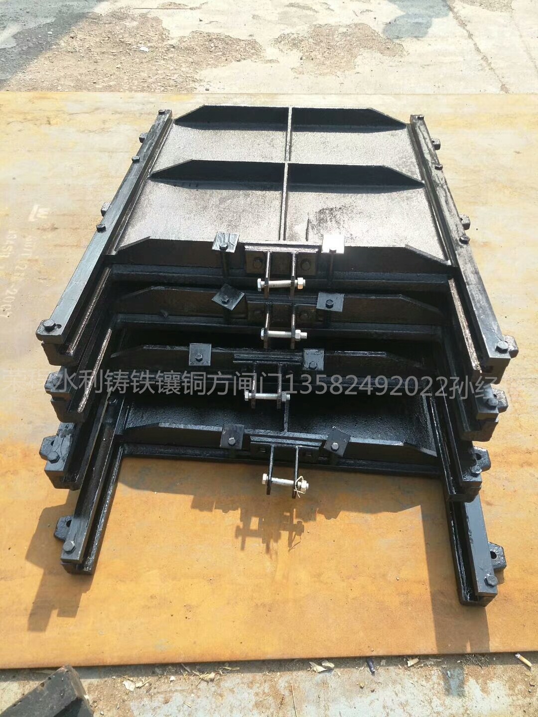 鑄鐵鑲銅閘門加銅條是因為門體平面精加工并帶有鑲銅條的槽,以便鑲入青銅密封面,門體兩側精加工與門框側槽配合,形成上下滑軌。門體上端設有吊耳,門體與吊耳的兩接觸面精加工之后用螺栓固定。吊耳的受力點靠近門體中心線,吊耳的銷軸孔用鏜床加工。為減少門體上下運行時的摩擦力,導軌和門框連接的接觸部位精加工,用螺栓聯接,并設有定位銷防止錯位,止水效果好。
